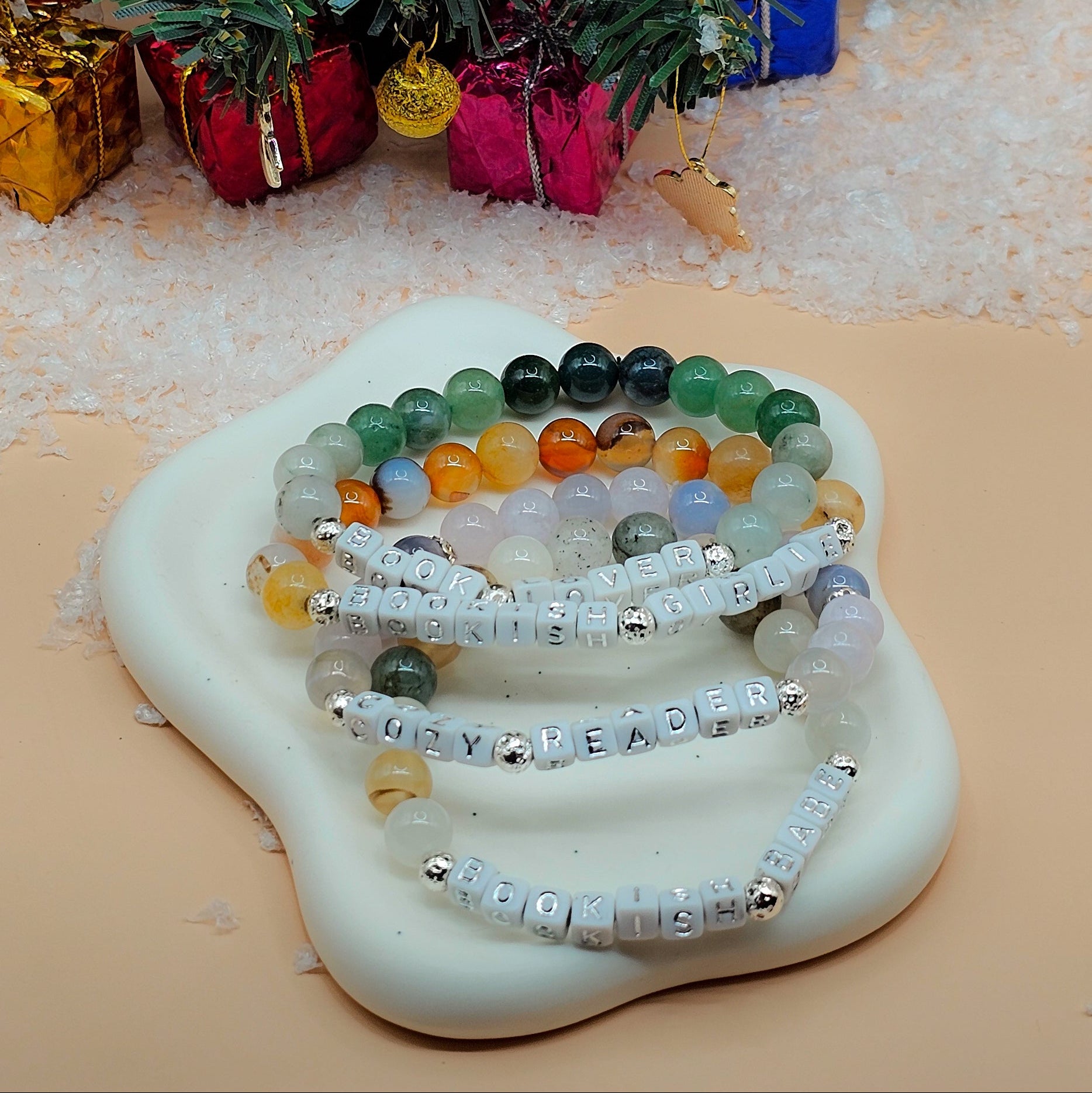 The Elite Tier Bookish Babe Stack is the fuller, more expressive version of our classic bestseller — a luxury gemstone bracelet set created for readers who love romanticizing everyday life. This set blends soft femininity with bold bookish identity, giving you aesthetic bracelets that feel stylish, intentional, and unmistakably book-lover-coded.