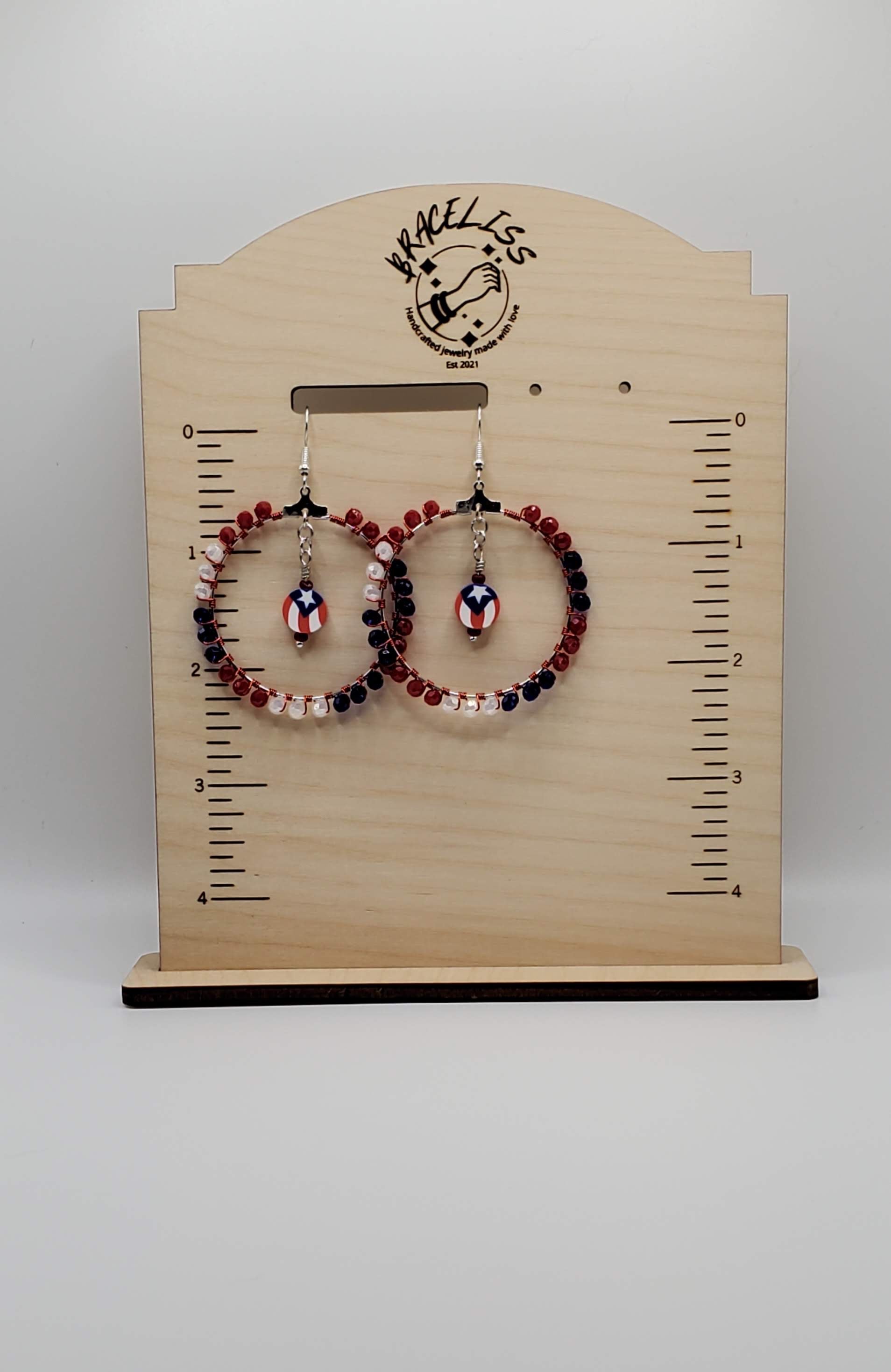 Silver hoop earrings with a Puerto Rico Flag dangle and faceted glass beads wrapped to the outer frame. Earrings are lightweight, they are easy to wear and perfect for everyday wear.