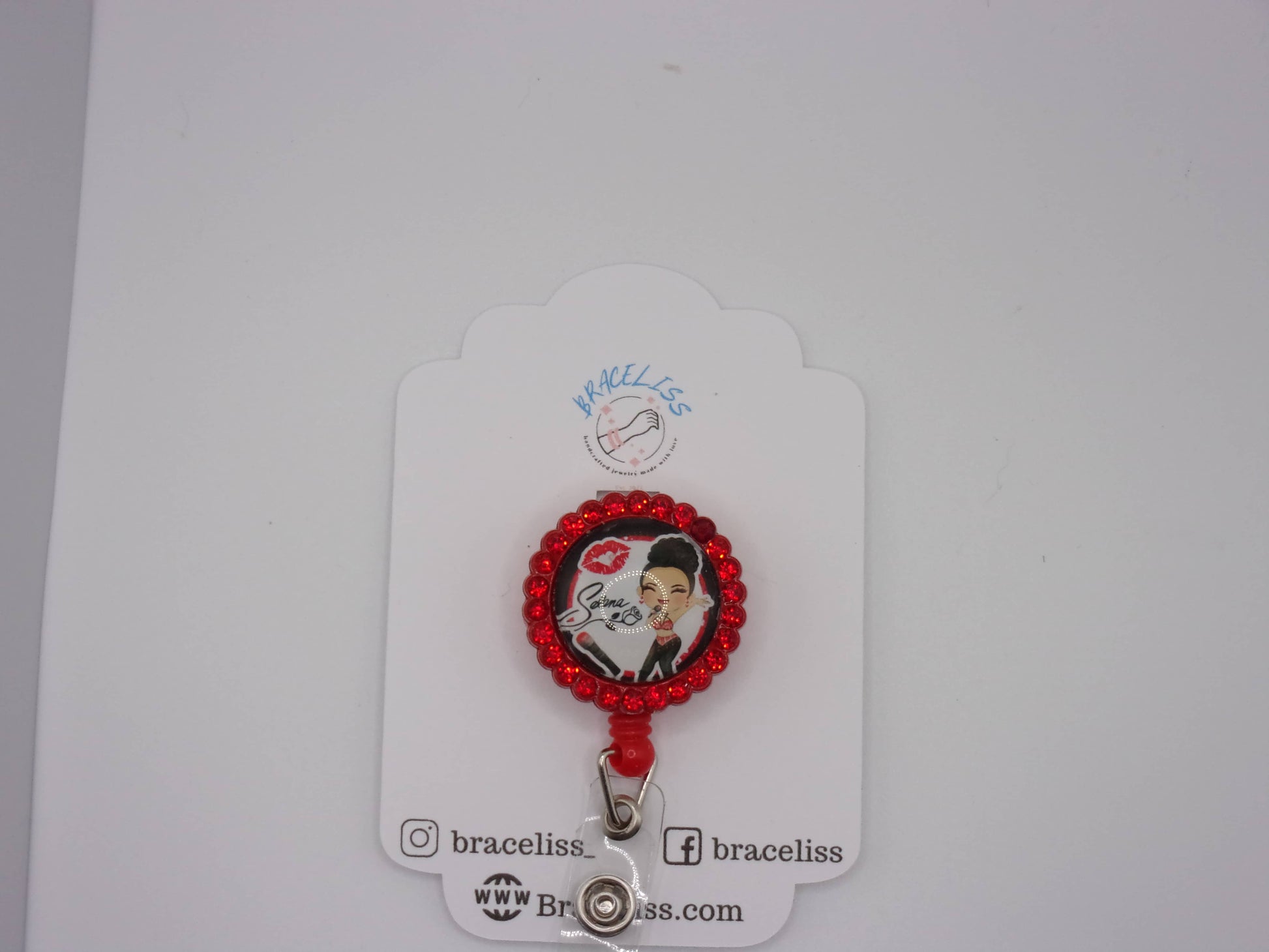 Singer inspired retractable badge reel with a belt clip. Badge has a red rhinestone bezel tray with an adorable image of a cartoon singer.Β